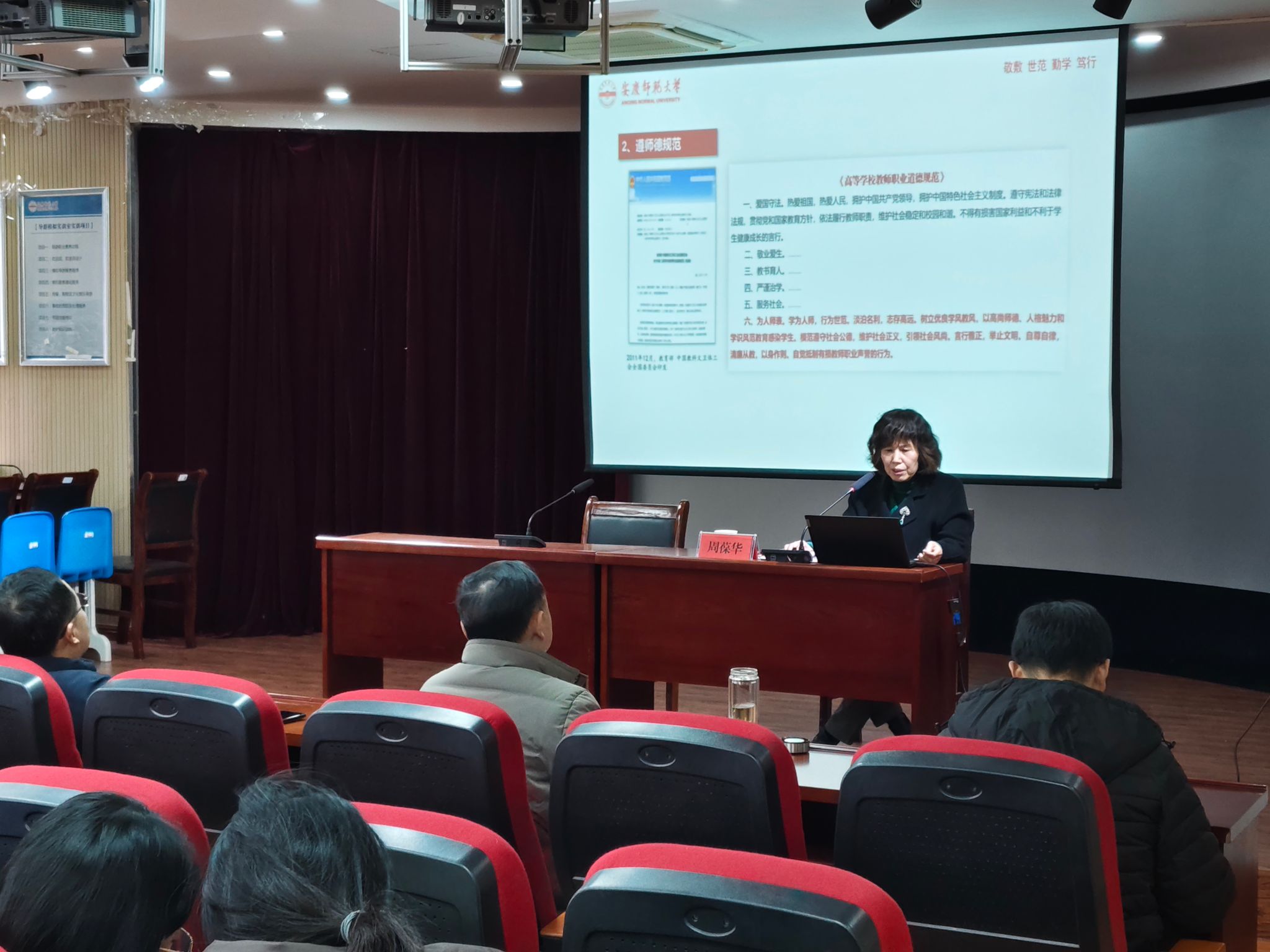 在F411报告厅举办师德师风专题报告会, 2022年学校“三全育人”最美老师之“教书育人”最美老师、校关工委秘书长周葆华教授以“浅谈新时代高校师德师风建设”为主题作报告,学院全体教职员工参加报告会。
