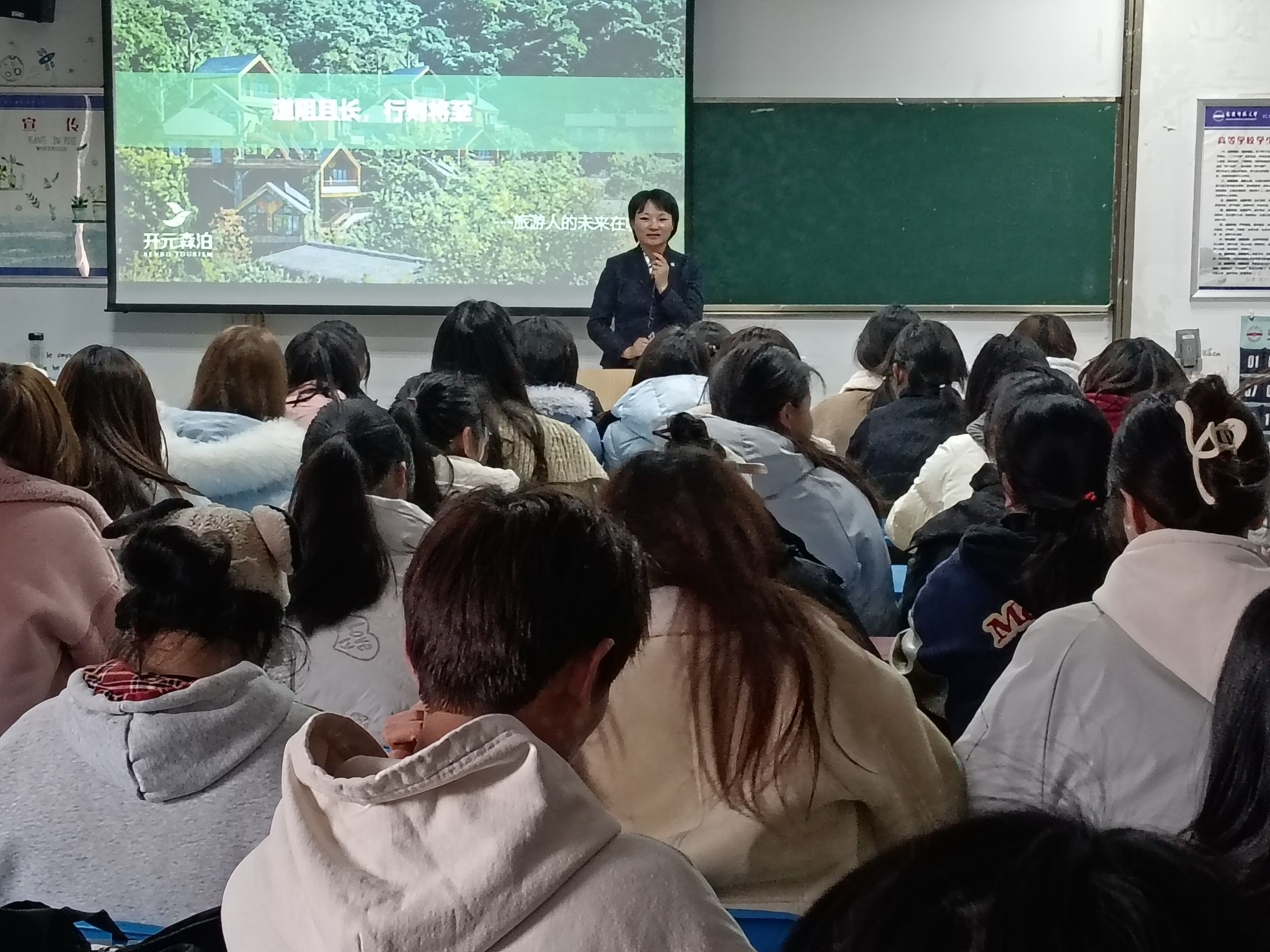 在F204教室开展优秀校友经验分享会,副院长朱磊主持会议。此次分享会特邀2018届旅游管理专业优秀毕业生,现任杭州开元森泊旅游投资有限公司人力资源经理吴燕女士担任主讲,以“道阻且长,行则将至—旅游人的未来在哪里”为主题,为2024级新生带来了一场精彩纷呈的成长导航课。