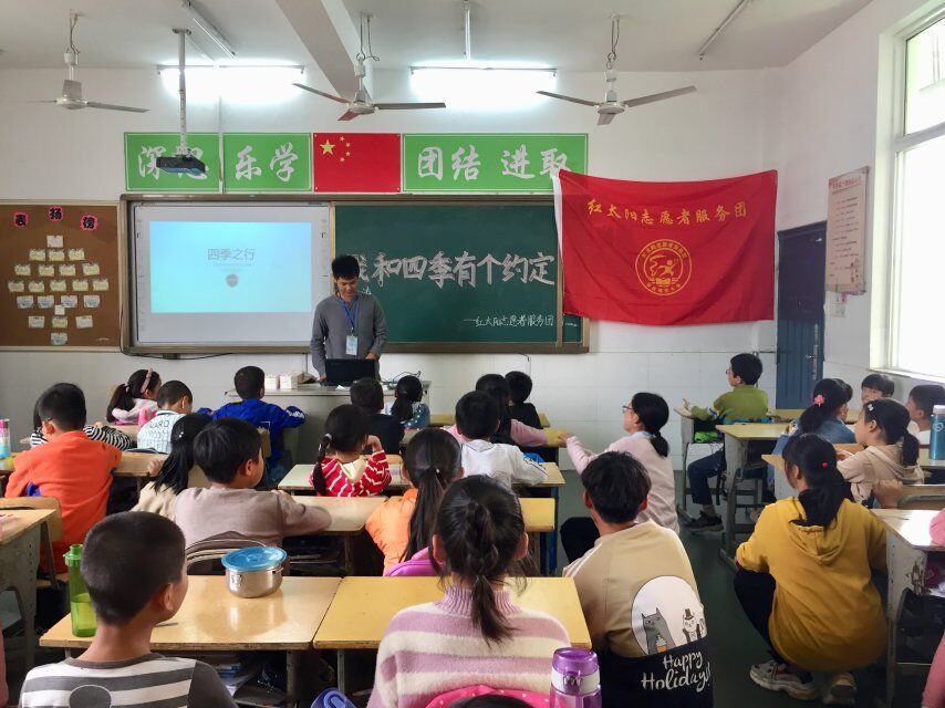 红太阳志愿者服务团来到十里中心小学,与留守儿童开展“四季之行”主题志愿活动,跟随着志愿者的步伐,小朋友们领略了四季的美景。