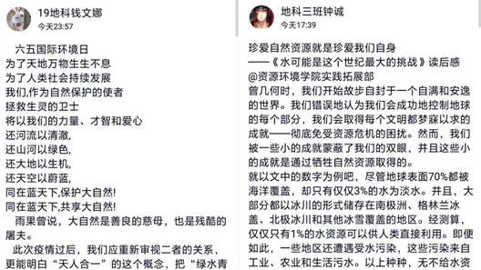 同学们纷纷表示,要从自我做起,从身边的小事做起如做到节约用水、做好垃圾分类等,用实际行动保护环境、关爱自然,养成绿色和谐的新生活方式,在做好疫情防控的同时更要保护好我们家园的环境。地理科学2019级3班的钟诚表示:“我们绝不能对资源环境的糟糕现状视而不见,绝不能用我们所取的成就掩盖危机,因为珍爱自然资源就是珍爱我们自身。”
