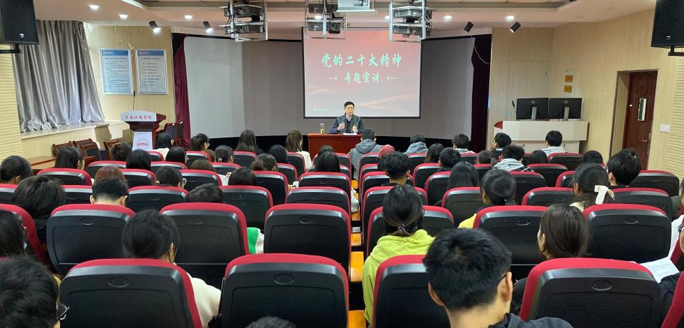 党委书记夏宏宇在F411报告厅宣讲党的二十大精神,学院第66期入党积极分子80余人聆听宣讲报告。
