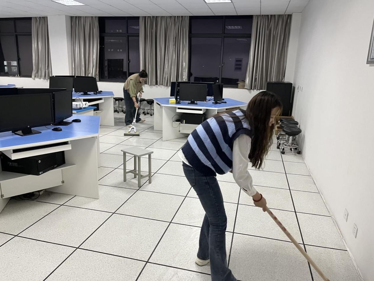 在院教学楼开展“劳动教育”志愿实践活动,15间教室、35个实验室、6个楼层走廊以及一楼大厅在50名学生志愿者的打扫下呈现出了干净整洁的“新面貌”。