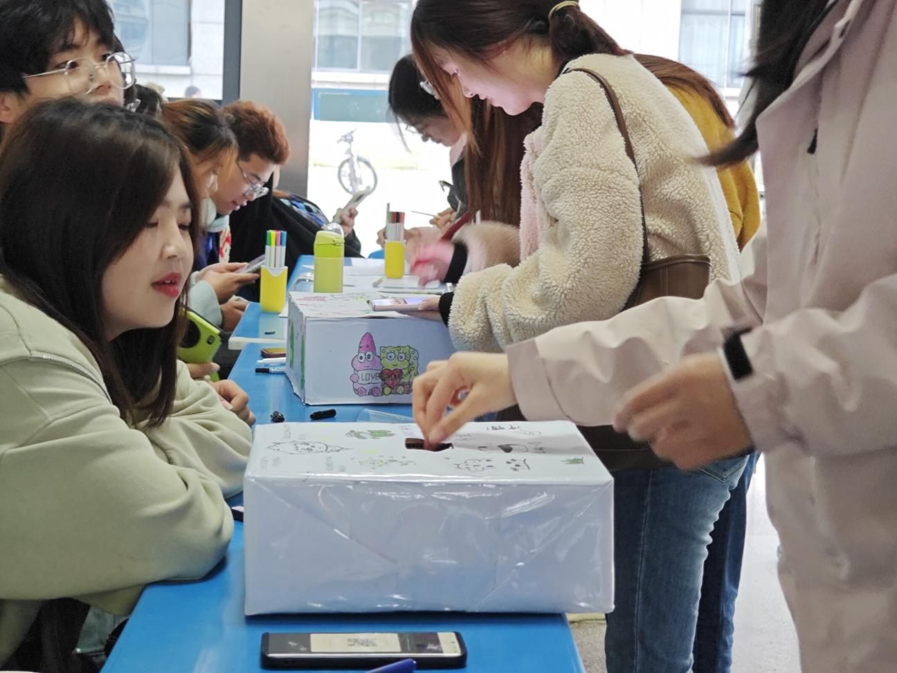而“解忧杂货铺”环节,则为同学之间的心灵交流筑起一道桥梁。工作人员在现场准备了“倾诉箱”和“解忧箱”,选择“解忧箱”的同学,要在卡片上写上一句温暖、积极、向上的话并投到纸箱中;而选择“倾诉箱”的同学,在把自己的烦恼忧愁投入纸箱后,也可以从“解忧箱”中抽取一张充满温暖祝福的卡片带走。通过情绪的分享和交流,同学们可以共同促进心理健康的发展。