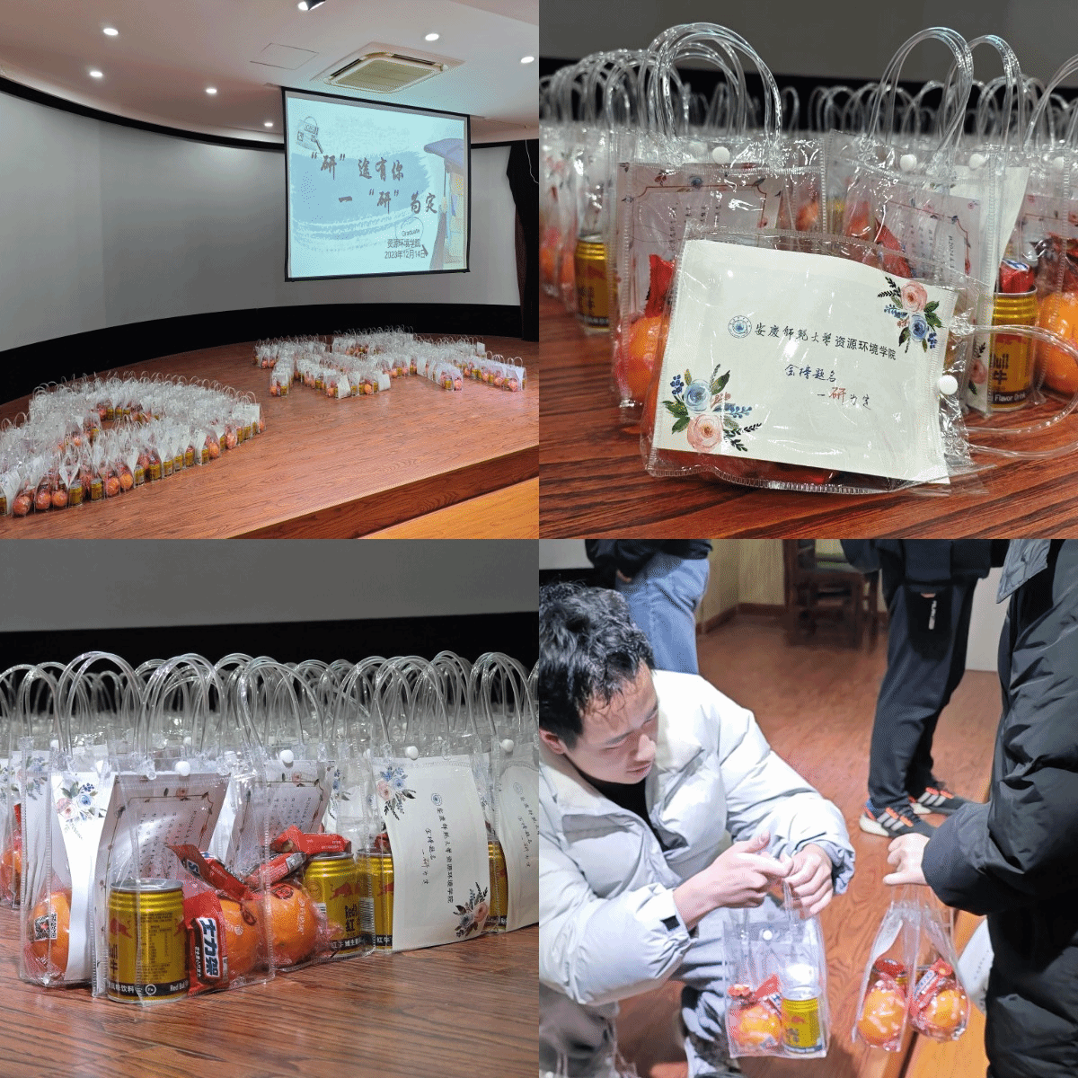 寓意“称心如意”的橙子、象征“能量满满”的饮料和巧克力棒,以及印着学院祝福语的卡片,300余份福气满满的“考研福袋”被整齐摆放成心形及“研”的字样。“来,同学,拿好你的考研福袋,祝福取得好成绩”手与手的交递之间,关怀与温情在流淌。地理科学专业2020级(2)班的张敏在打开考研福袋后展露出笑颜“非常感谢学院准备的这些独特小礼物,我也深切感受到了学院对我们学生的关心和支持。接下来我定会全力以赴准备考试,迎接春暖花开!”