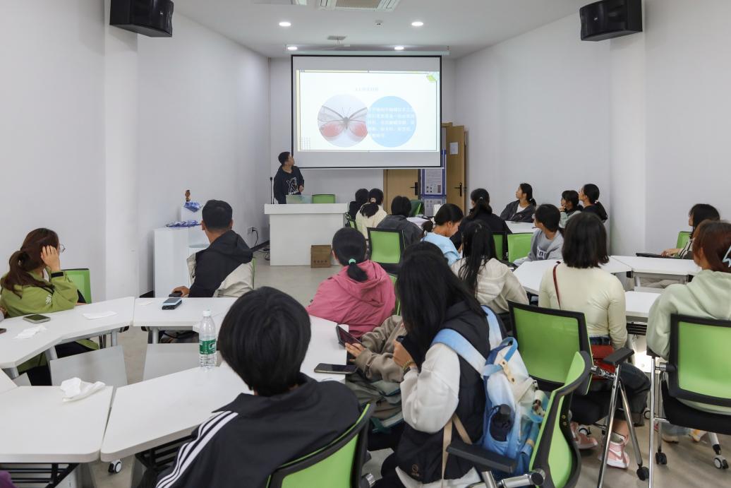 左手持原蝶标本,右手执注射器,将温水注射到原蝶体内直至原蝶软化,生物技术专业2023(2)班的刘保君担任此次活动的“小老师”,引导着学生制作蝴蝶标本。“用昆虫针固定原蝶时要尽量避免碰到蝴蝶的翅膀。”刘保君解释,蝴蝶翅膀十分脆弱,对于第一次制作蝴蝶标本的学生而言,将蝴蝶完好无损地固定在硬纸板上是极具挑战性的环节。