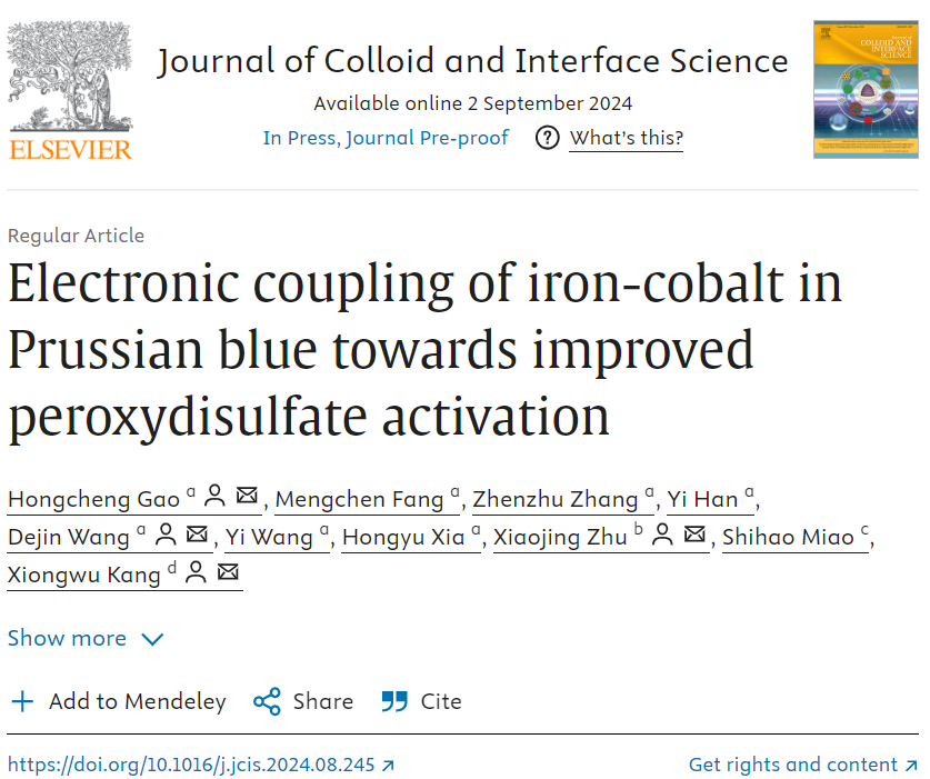 环保高端装备与污染控制研究团队成果“Electronic coupling of iron-cobalt in Prussian blue towards improved peroxydisulfate activation”在中科院一区TOP期刊《Journal of Colloid And Interface Science》(影响因子9.4)发表。团队成员高洪成博士为第一作者。