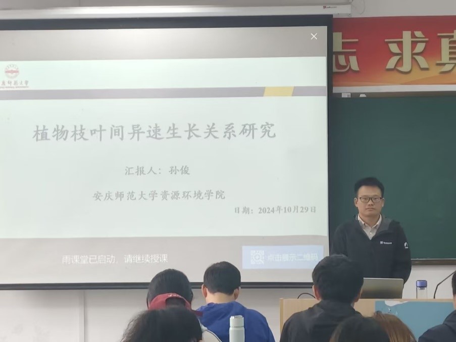 青年教师孙俊博士于2024年10月29日上午在F204作了“植物枝叶间异速生长关系研究”的学术报告,部分地理科学专业研究生和本科生参加了讲座。