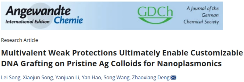 教师宋磊在国际TOP期刊《Angewandte Chemie International Edition》(中科院SCI一区TOP期刊)发表题为“Multivalent Weak Protections Ultimately Enable Customizable DNA Grafting on Pristine Ag Colloids for Nanoplasmonics”的研究成果。《Angewandte Chemie International Edition》是国际化学领域最具影响力的顶级学术期刊之一,在全球化学界享有极高的声誉,影响因子为16.1。据悉,这是我校首次在该刊物发表学术研究论文。