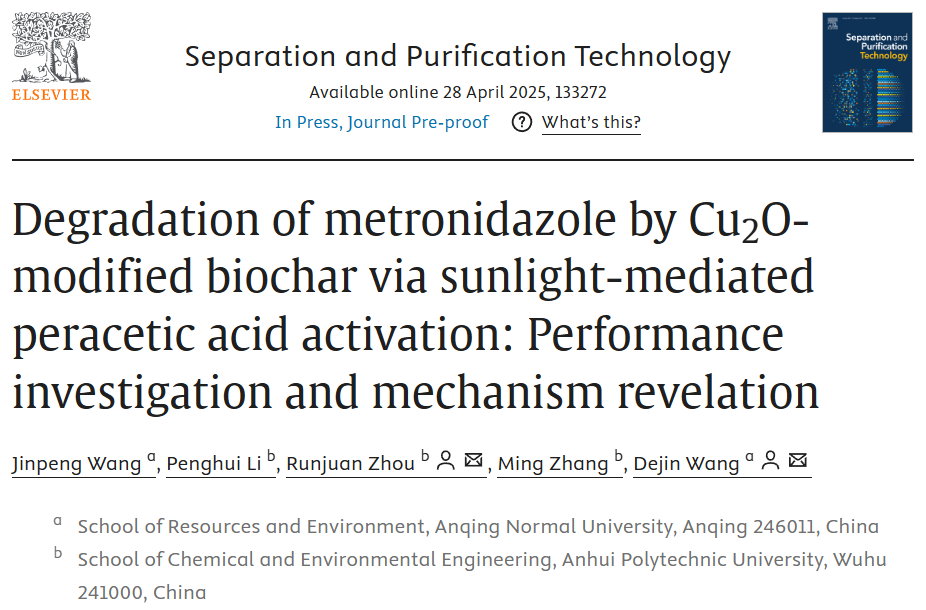 环保高端装备与污染控制研究团队汪金鹏博士以第一作者在《Separation and Purification Technology》期刊(中科院2区,Top,IF=8.2)发表“Degradation of metronidazole by Cu2O-modified biochar via sunlight-mediated peracetic acid activation: performance investigation and mechanism revelation”研究论文。老司机论坛