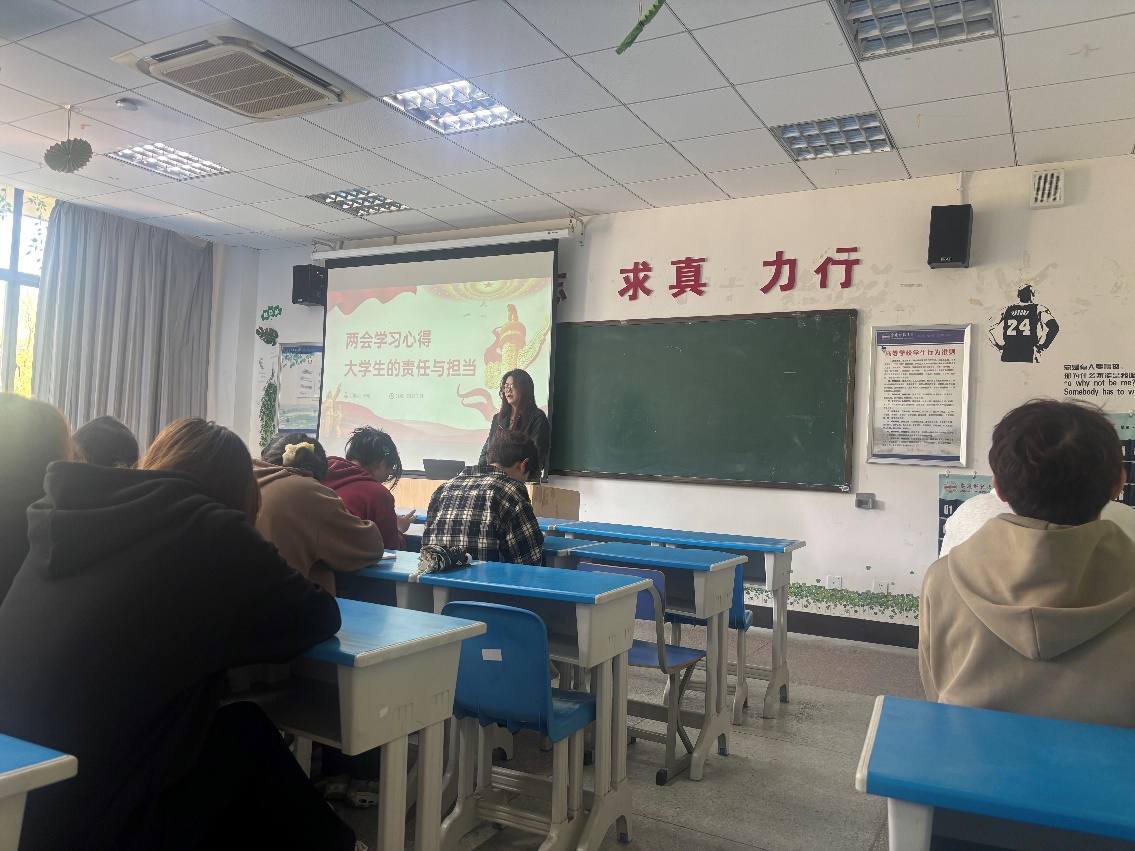 辅导员杨煜老师肯定了同学们在分享过程中的精彩表现和认真态度,随后她总结了两会对于国家发展的重要意义。对于新时代的大学生而言,关注时政不仅是了解国家发展动态的重要途径,更是培养社会责任感和家国情怀的关键,她鼓励同学们要将两会精神融入到日常的学习和生活中,不断提升自身素质。