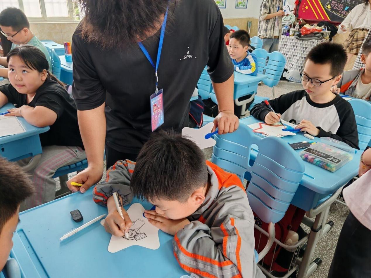 图为志愿者正在指导小朋友进行绘画创作
