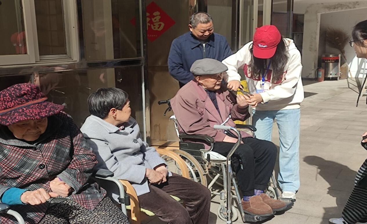 在上午时分,志愿者陪同老人一起前往庭院晒太阳。志愿者为老人提供了剪指甲、聊天等贴心服务。除此之外,志愿者还自发为老人表演节目。在志愿者与老人的交谈中,曾经担任过会计的张赵鹏老人与志愿者们分享人生经历,勉励青年学子把握时代机遇,不负党和国家。近午时分,为避免打扰老人用餐,志愿者与老人告别。