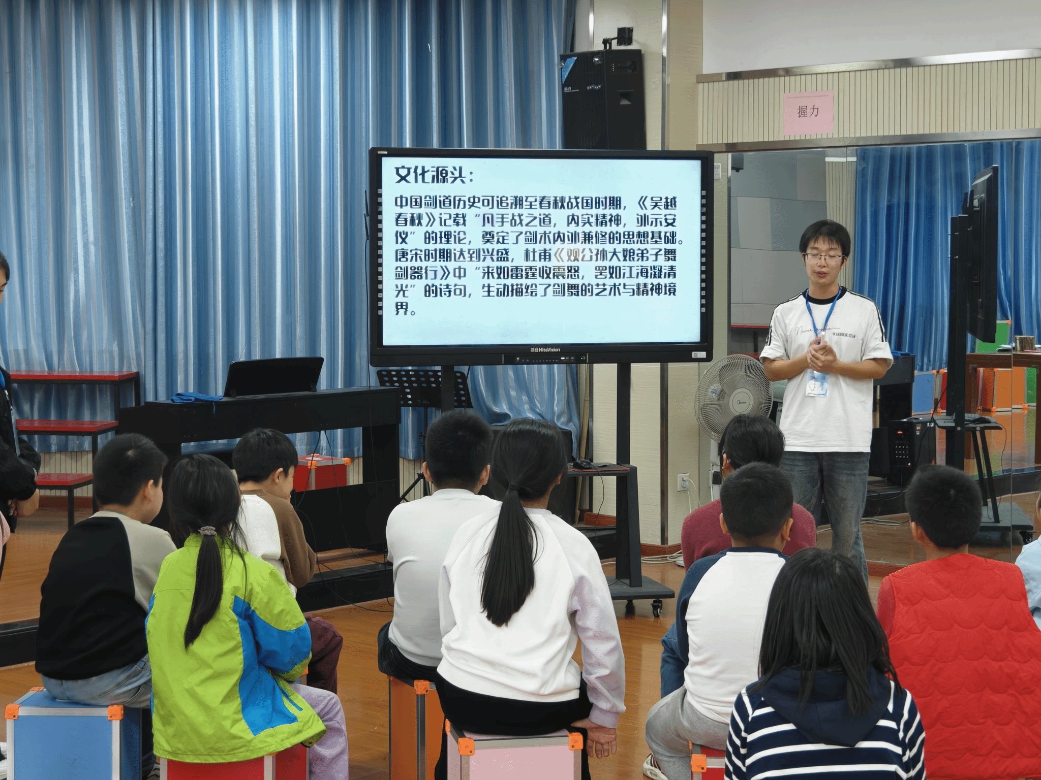 活动伊始,2025级地理科学(3)班唐龙尧化身“文化信使”,借助图文展板为孩子们讲述十大名剑的传奇故事。从 “湛卢剑”的铸剑渊源、“七星龙渊”的忠义传说,到“干将莫邪”的深情典故、“鱼肠剑”的侠义之举,志愿者以通俗叙事搭配古画插图,生动解读剑文化中 “刚正不屈” 的精神内核,阐释 “以剑喻德” 的传统文化深意,点燃孩子们的探索热情。