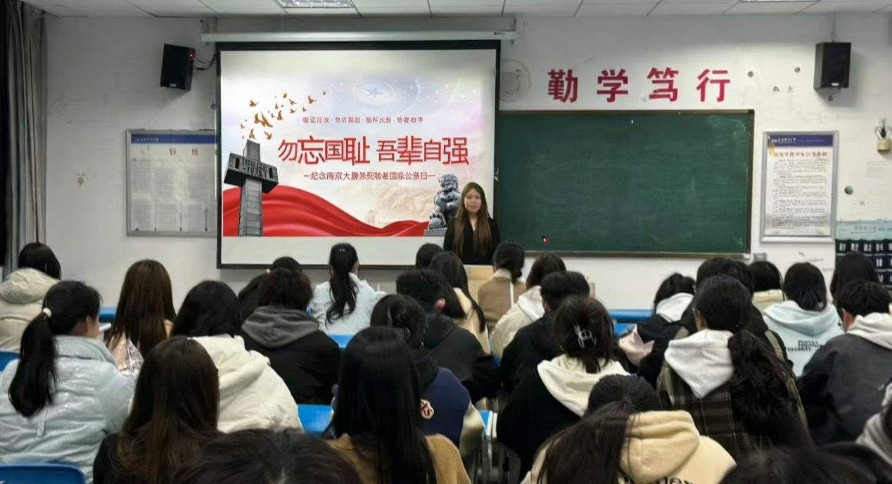 各班级结合自身特色创新活动形式,以庄重仪式与深刻感悟致敬历史。2024 级旅游管理 1 班学子提前查阅史料,通过轮流讲述南京大屠杀亲历者故事的方式还原历史真相,在具体人物与事件细节中体悟民族苦难、传承红色记忆;2023 级环境工程 2 班以肃穆的哀悼默念仪式拉开活动序幕,全体同学低头静立追思遇难同胞,随后共同观看《南京大屠杀》纪录片,黑白影像中定格的惨痛历史画面,让学子们深刻体会战争残酷与和平珍贵,进一步坚定铭记历史、守护和平的信念。