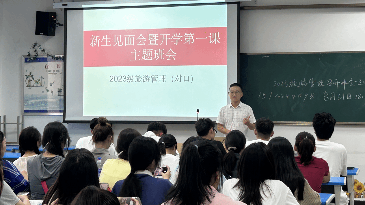 8月31日下午,2023级旅游管理(对口)专业于F207教室召开2023级新生见面会暨开学第一课主题班会,会议由辅导员訾纪辉主持。